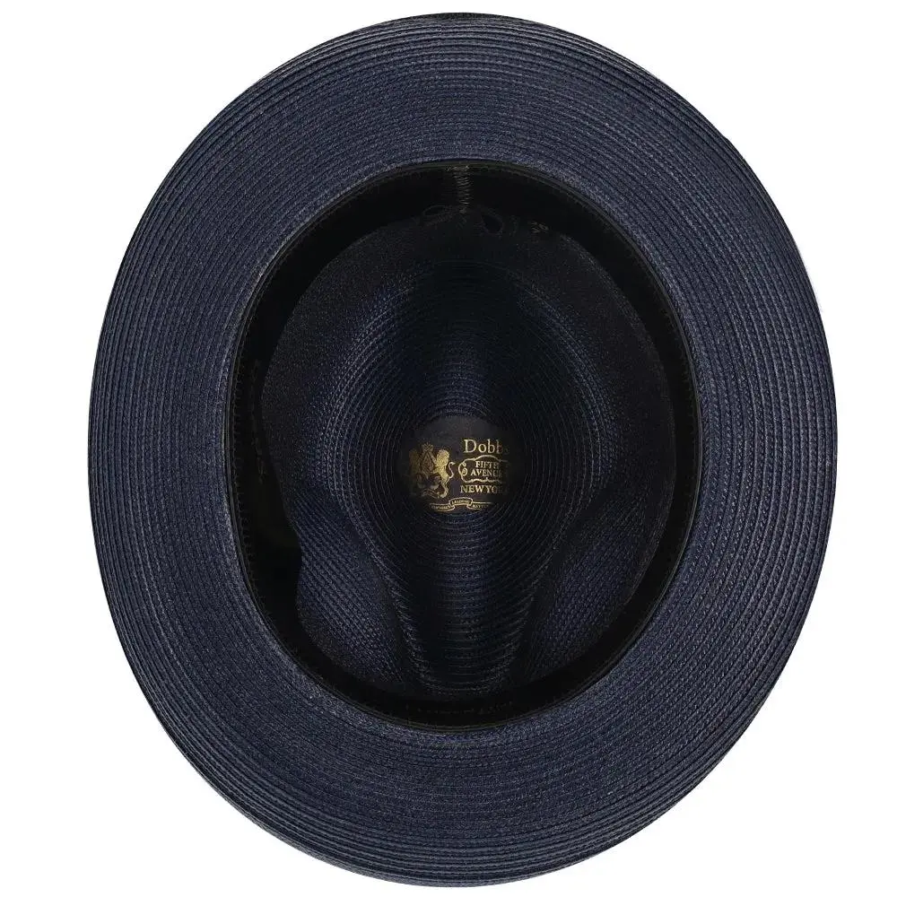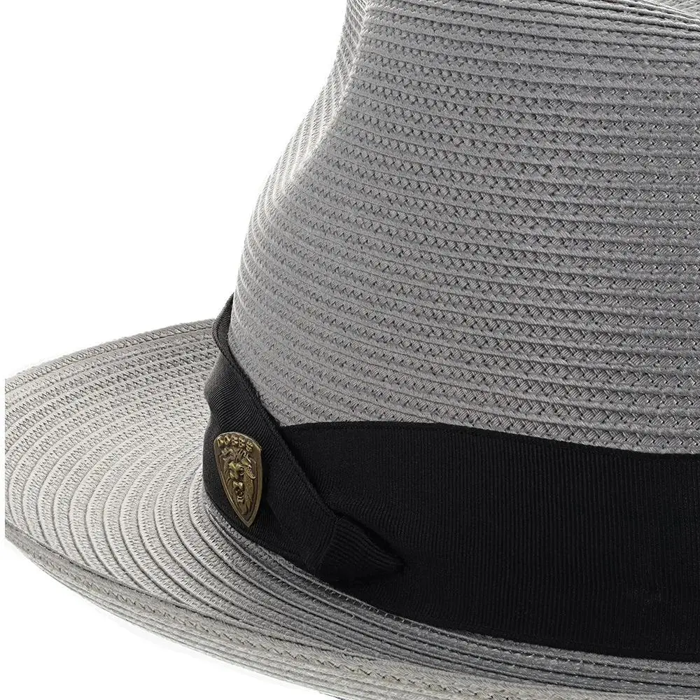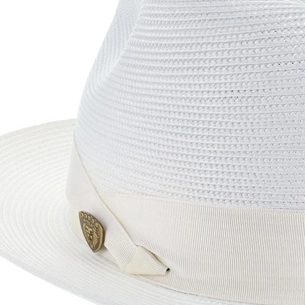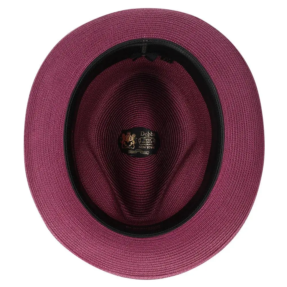 The fedora is made with Florentine Milan straw, which is lightweight and breaths easily. It also features a leather sweatband, center dent crown and a 2.5" brim that is situated below a satin band with a Dobbs hatpin featuring a lion's head.
